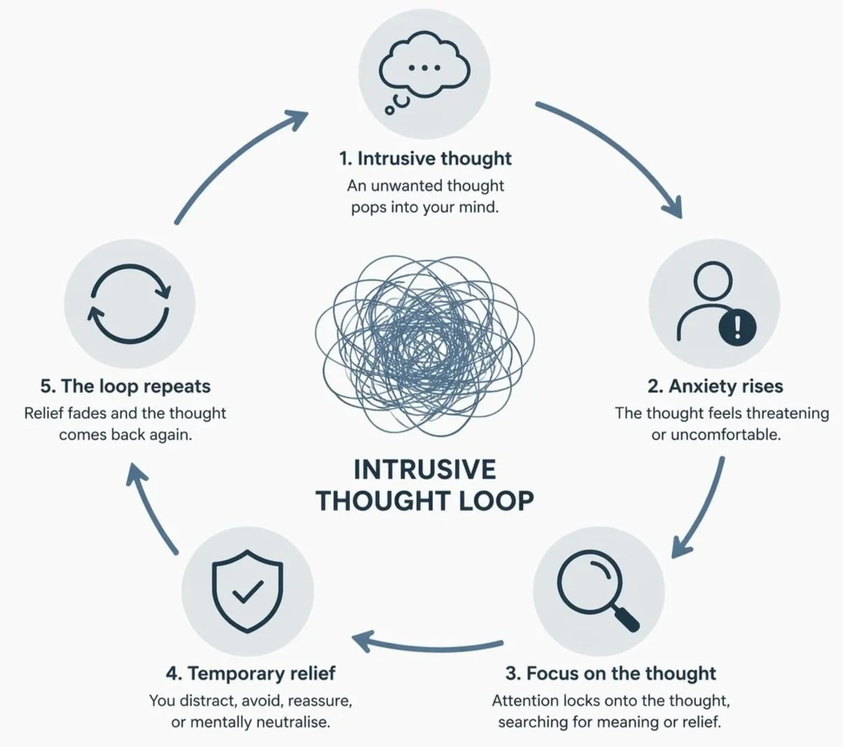 The brain produces thousands of thoughts every day, and not all of them are rational, flattering, or consistent with who we are. That's not a flaw in the system. It's what a pattern-generating organ does. The mind is constantly running through possibilities, including ones that are unpleasant or disturbing. For most people, these pass quickly without comment. For others, usually because of anxiety, stress, past trauma, or how the thought gets interpreted, the thought catches and begins to loop.